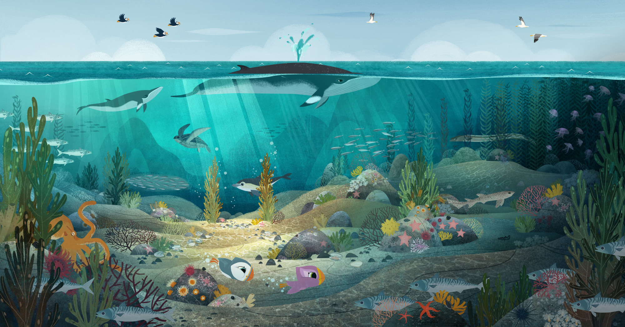 Out at sea the winds can be strong, and the weather can change quickly, painting the cold seas in so many shades of blue, grey and green. Whales dive into the deepest canyons, but breathe the same air as you on the surface. You will meet shapeshifting octopus, stealthy eels, sparkly plankton, beautiful jellyfish and cute anemones! This marine home is a collage of underwater habitats, like cities - connected to one another, and every creature plays a part in the ocean's incredible story.